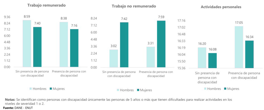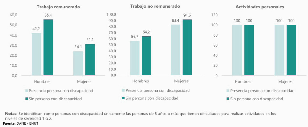 En ese estudio el DANE reveló cuál es la participación a nivel nacional en grandes grupos de actividad, según sexo y presencia de personas con discapacidad en el hogar, como se ve a continuación: